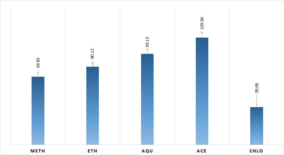 Fig. 1: Comparative study of total flavonoid content in different solvents used for extraction of bark samples. Values are expressed in mean±SE (n=30 for each bar)