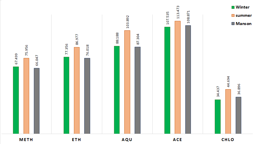 The results of the analysis in Section 2 are presented in fig. 2. This graph illustrates the comparison of the three seasons studied for all extracts. To calculate this, plant samples collected over two consecutive years (total 10 samples from each season) were aggregated to gather data season-wise. The graph distinctly shows the highest flavonoid content in samples collected during the summer (p<0.05). However, for each extraction system, no significant change was observed between samples collected in winter and monsoon seasons.