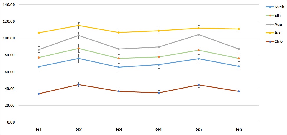 In all the following figures, the abbreviations and symbols used are as follows: Meth (methanolic extract), Eth (ethanolic extract), Aqu (aqueous extract), Ace (acetone extract), Chlo (chloroform extract), Benz (benzene extract). Samples 1-5, collected in winter (January 2016), are represented as group-1 (G1); Samples 6-10, collected in summer (May 2016), are represented as group-2 (G2); Samples 11-15, collected in the rainy season (September 2016), are represented as group-3 (G3); Samples 16-20, represented as group-4 (G4), were collected in winter (January 2017); Samples 21-25, collected in summer (May 2017), are represented as group-5 (G5); and Samples 26-30, collected in the rainy season (September 2017), are represented as group-6 (G6).