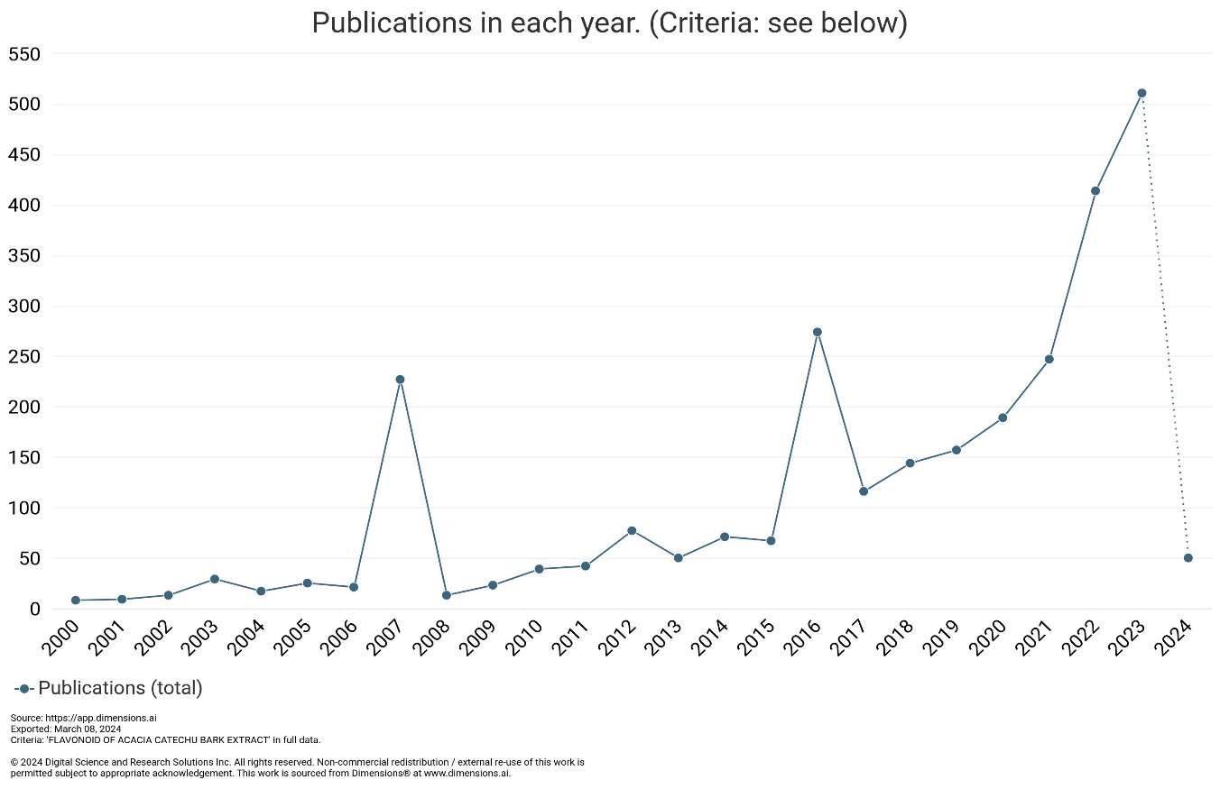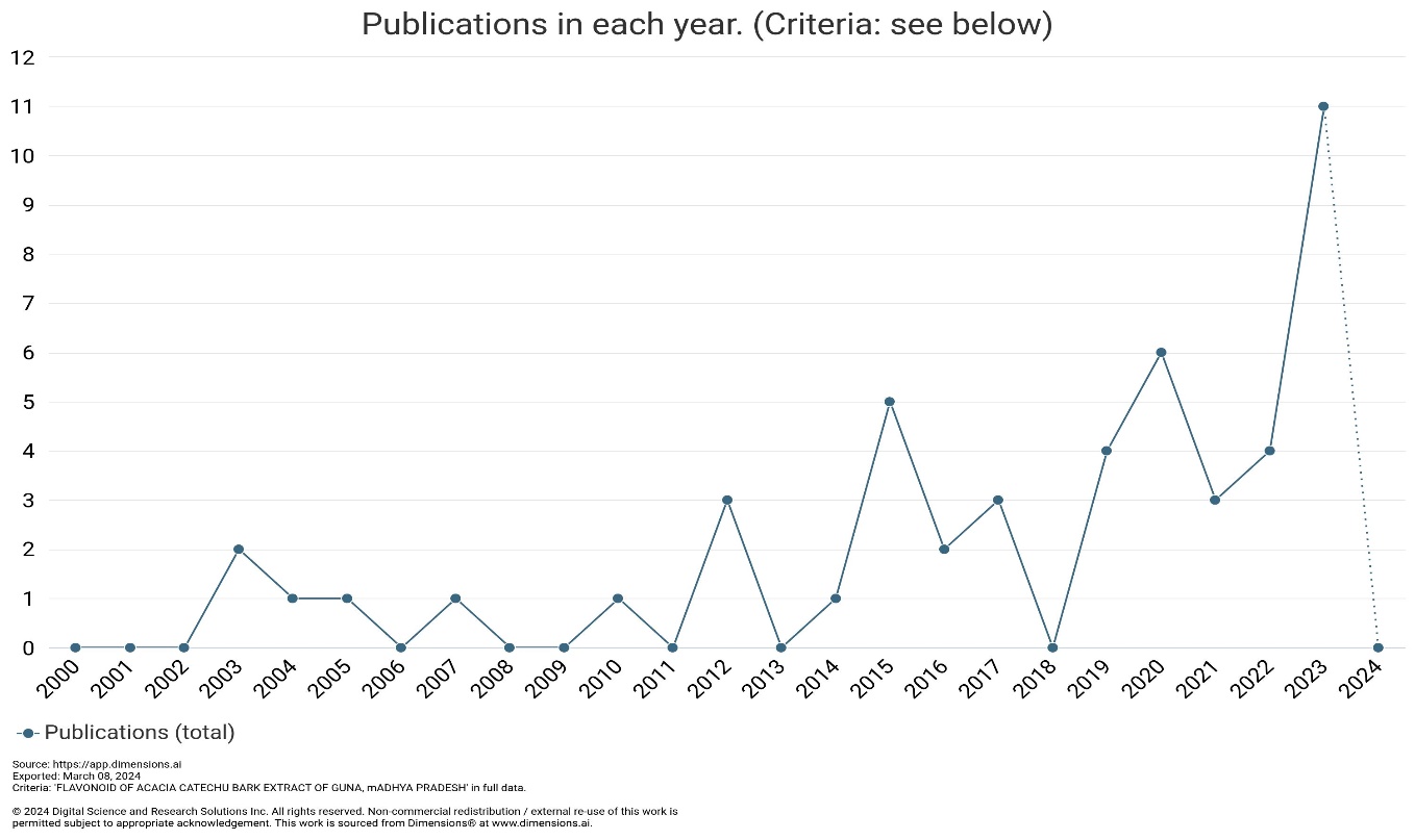 Fig. 4: Database showing number of publications from 2000-March 8, 2024 on ‘flavonoid of Acacia catechu bark extract’