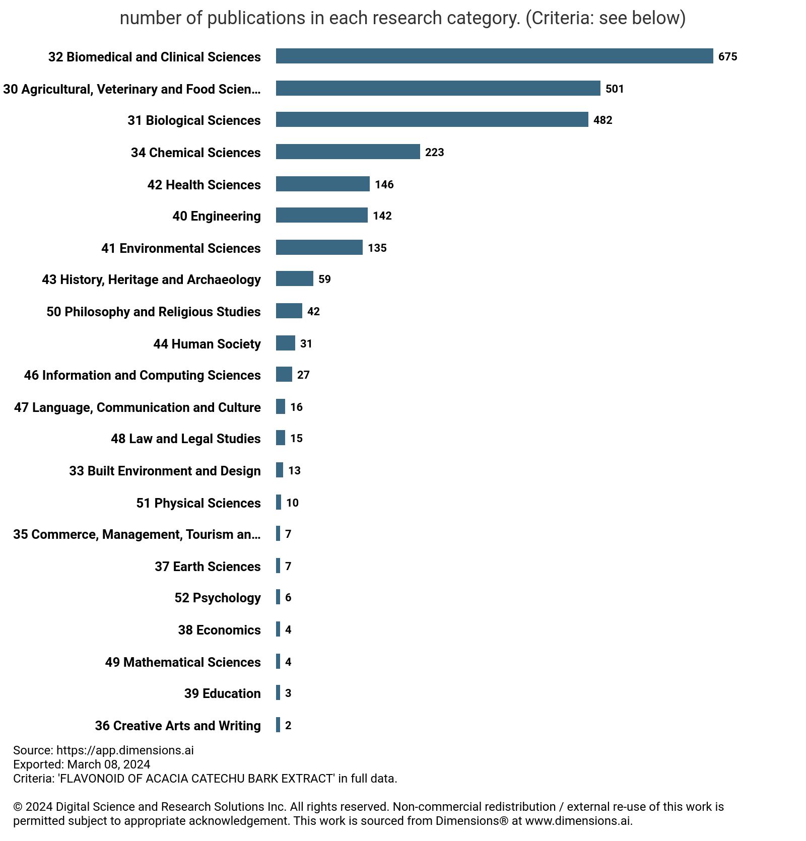 Fig. 6: Database showing number of publications in different research categories from 1975-March 8, 2024 on ‘flavonoid of Acacia catechu bark extract’