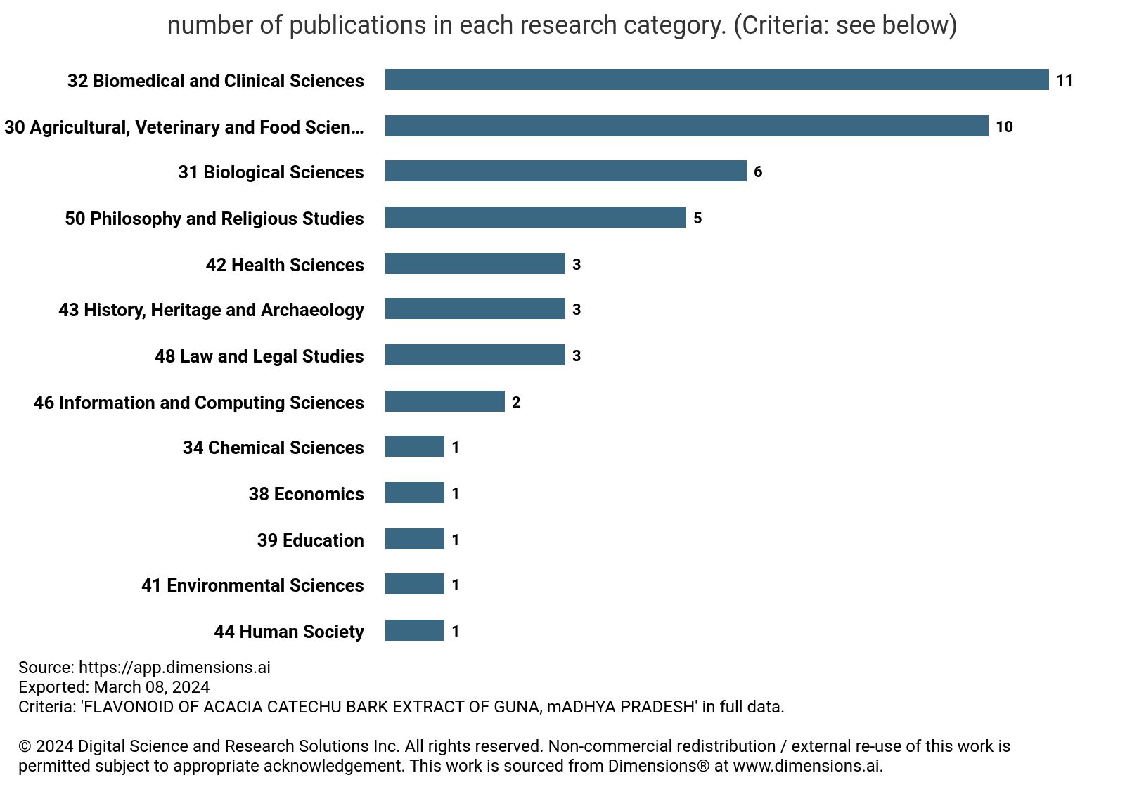 Fig. 7: Database showing number of publications in different research categories from 1975-March 8, 2024 on ‘flavonoid of Acacia catechu bark extract of Guna district, Madhya Pradesh’