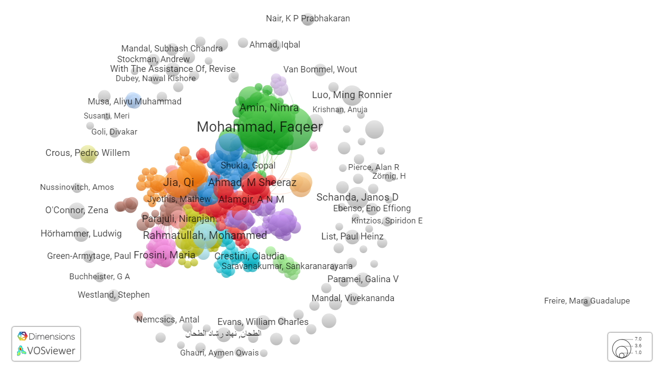 Fig. 8: Co-authorship study using dimensions database and VOS viewer from 1975-March 8, 2024 on ‘flavonoid of Acacia catechu bark extract’