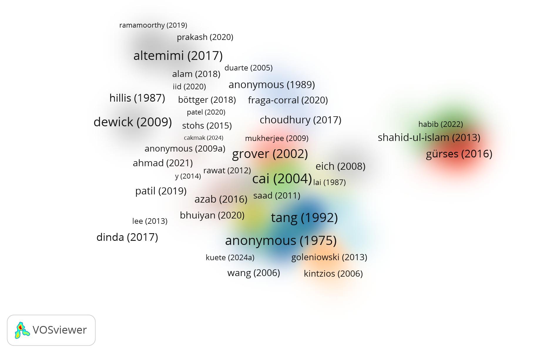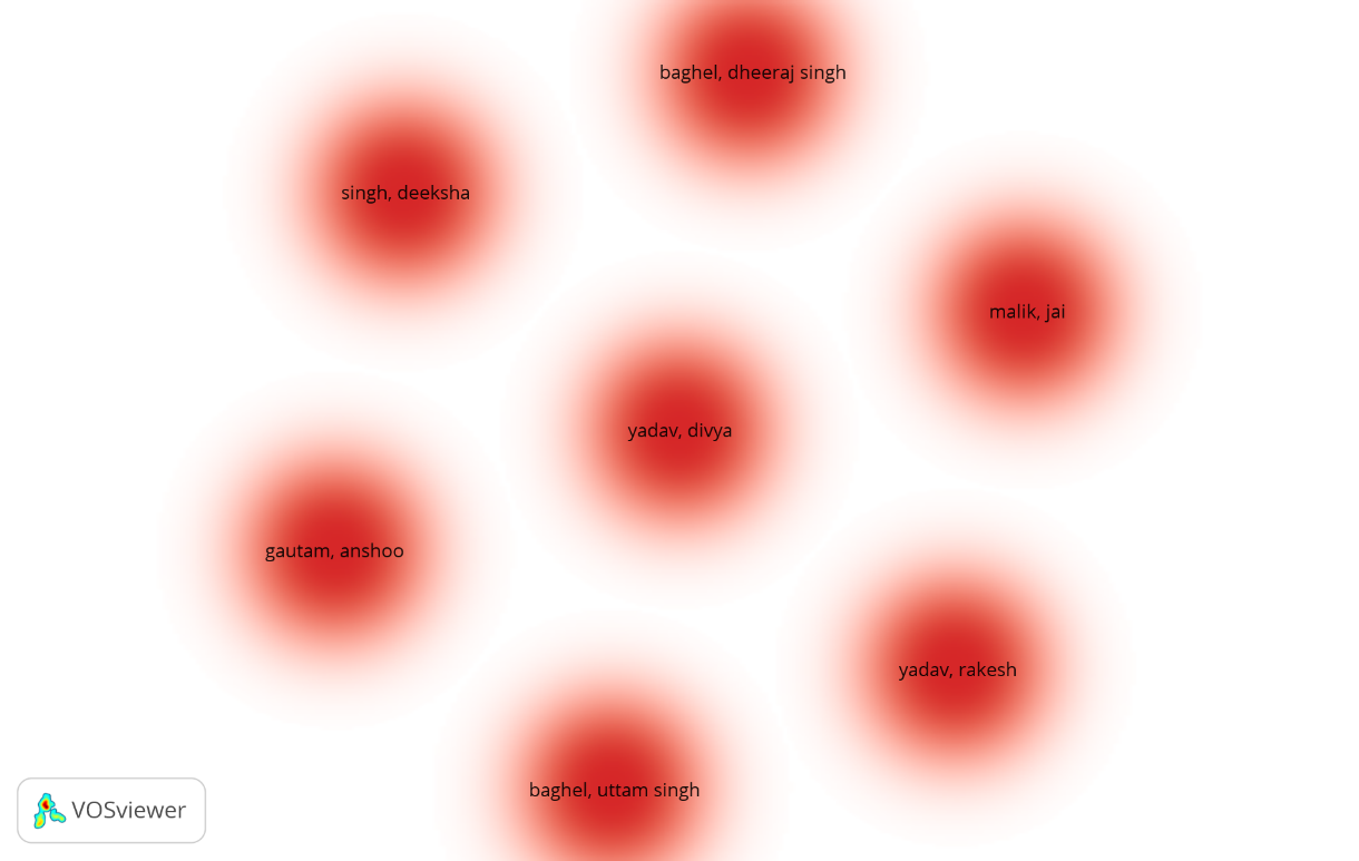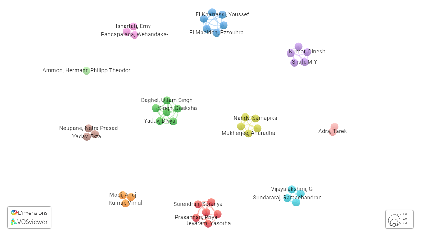 Fig. 9: Co-authorship study using dimensions database and VOS viewer from 1975-March 8, 2024 on ‘flavonoid of Acacia catechu bark extract of Guna district, Madhya Pradesh’