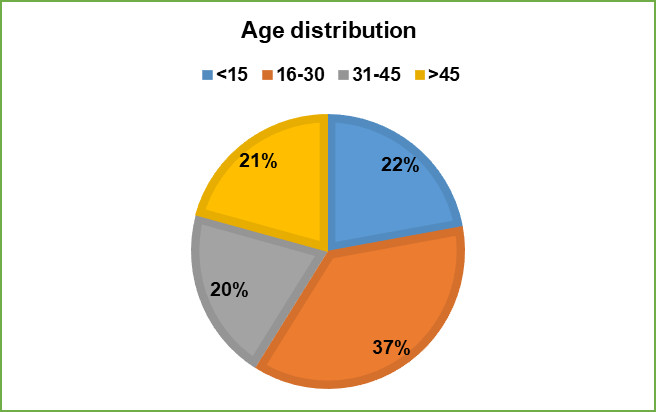 The age distribution of animal bite victims, as shown in fig. 1, indicates a predominant occurrence in the 16-30 age group, accounting for 36.79% of the cases. The distribution is relatively balanced, with significant proportions in the 31-45 (20.36%) and>45 (20.71%) age groups. Moreover, children under 15 make up 22.14% of reported cases.