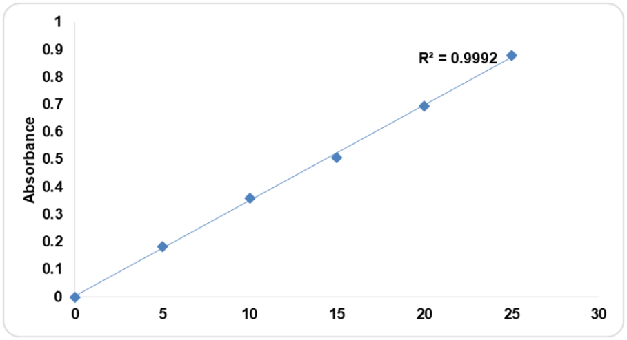 To confirm the dependability of the proposed method, calibration curves were constructed in the concentration range of 5–25 μg/ml. NAC followed Beer's law within this 5–25 μg/ml range, demonstrating exceptional adherence, with a regression equation of Y = 0.0347x+0.0029. The correlation coefficient (r) was more significant than 0.9992, indicating the robustness of the standard curve. All stock solutions and working standards were prepared in 0.1N NaOH, and the calibration curve data are presented in table 1 and fig. 3.