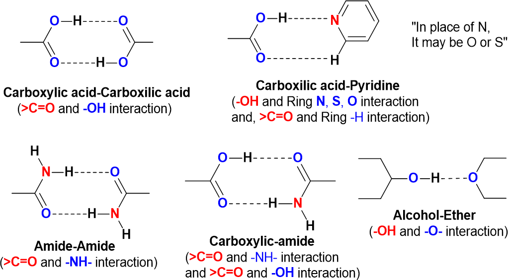 Fig. 3: Hydrogen bonding between suitable functional groups of drugs and co-former according to supramolecular synthon approach [29]