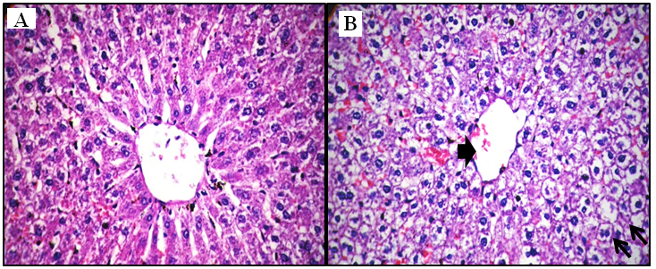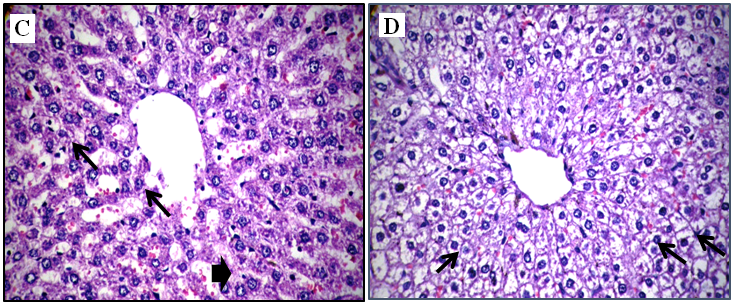 Rats were euthanized under chloroform vapor and sacrificed. Liver of each animal was dissected and weighted then immediately washed with isotonic saline solution and then divided into two parts. The first part stored at-80 °C for biochemical analysis. On the other hand, the second part was suspended in 10% buffered formalin for fixation and preparation to histopathological examination.