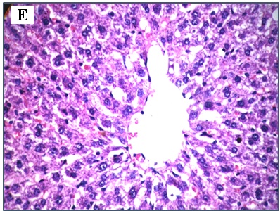 Fig. 1: Photomicrograph of rat liver sections showing control group (A) apparently healthy hepatic parenchyma (H&E X= 400). Massive vacuolar degeneration of hepatocytes together with dilated and congested blood sinusoids in VPA group (B) (H&E X 400). Dilated blood sinusoids (arrow head) with atrophied hepatic cord in B-V group (C) (H&E X= 400). (L-V) group (D) showing swollen hepatocytes with faint cytoplasm (H&E X 400). (B-L-V) group (E) apparently healthy hepatic parenchyma (H&E X= 400)