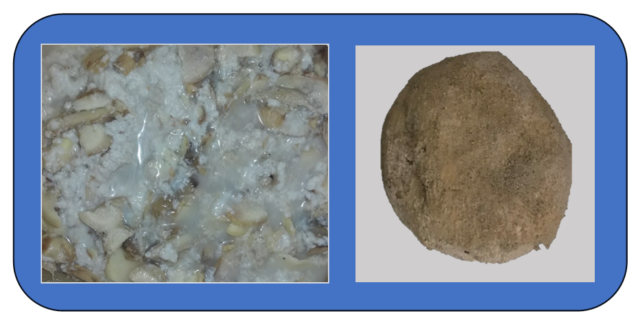 Fig. 1: (a) Fermented mass of Aduwa ko Jaanr, (b) Marcha, the starter culture