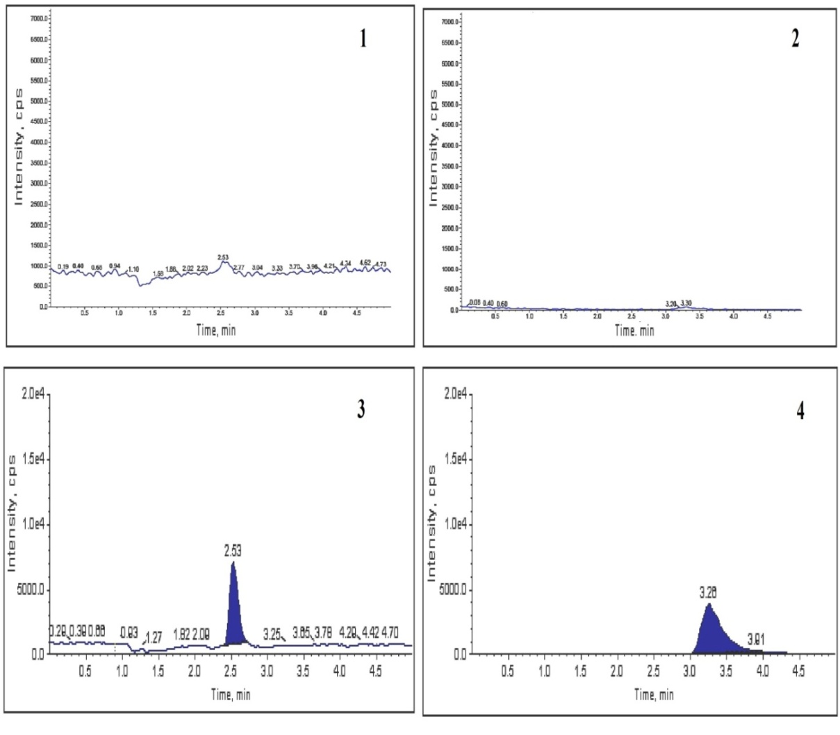 Fig. 2: Representative LC-MS/MS chromatograms of ILO and OLA in rabbit plasma (1) blank plasma at 427.0/190.1 (2) blank plasma at 313.1/256.2 (3) Standard spiking of ILO in plasma (4) Standard spiking of OLA in plasma. The retention times for ILO and OLA (IS) are approximately 2.5 and 3.2 min respectively