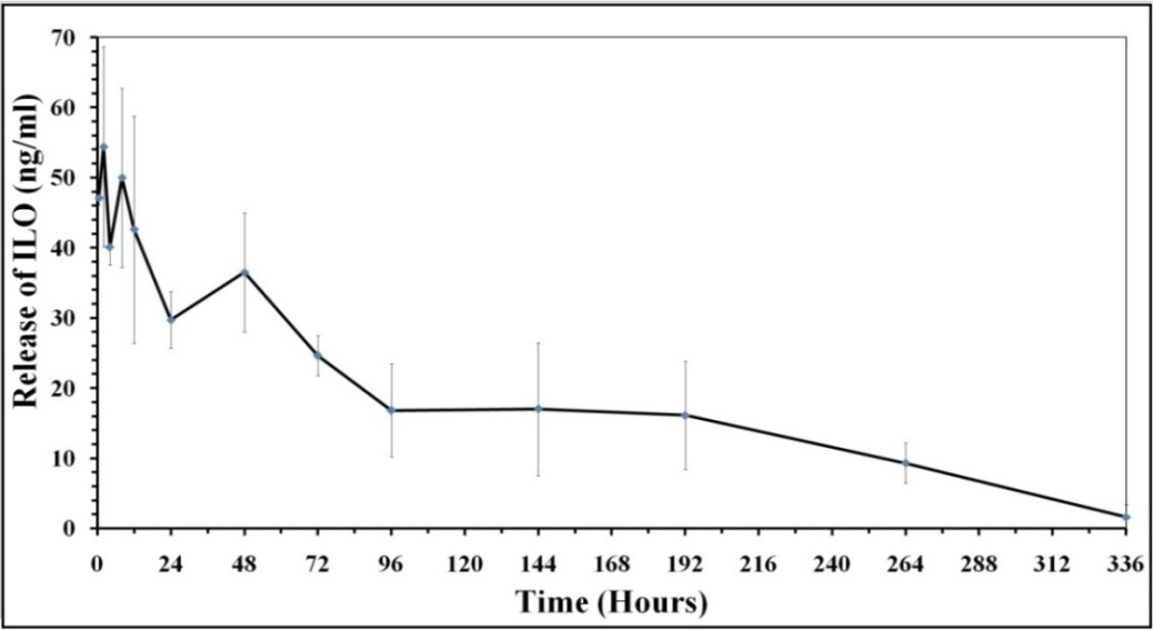 In the present work rapid, sensitive and fast LC-MS/MS method has been developed and optimized. Very high extraction efficiency (more than 95%) with lowest detection limit (0.5 ng/ml) and simple chromatographic conditions make it applicable to study pharmacokinetic parameters of ILO in rabbit. Animal study shows that remarkable release of ILO after an intramuscular injection to rabbit. Release of ILO was observed up to 14 days, and in future if the issue of initial bust release is controlled using formulation techniques then the developed formulation can be used as long acting formulation. Thus, in vivo study result provides a very informative platform for the development of long acting dosage forms.