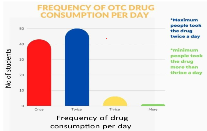 Our survey study showed that 43% of students used the medication once a day, 50% used the medication twice a day, and 6% used the medication thrice a day, while 1 % used the medication more than three times a day. There hasn’t been much research done on frequency of intake of the OTC drugs. Although this study attempted to highlight this crucial aspect, fortunately, we were unable to identify any abusive tendencies among medical students.