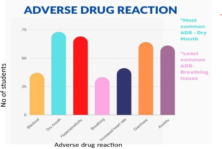 The common ADR observed by the medical students using OTC drugs are; Dry mouth (73%), Hypersensitivity (69%), Diarrhea (64%), Anxiety (61%), Increased heart rate (41%), Blackout (37%), Breathing issues (33%) and Others (1%). Adverse Drug Reaction (ADR) report analysis was done according to Med DRA.