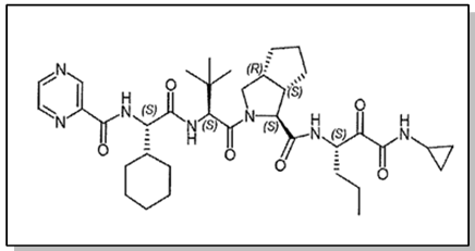 Telaprevir is a HCV (hepatitis C virus) protease inhibitor which inhibits HCV replication by binding the active site of NS3 4A serine protease and preventing cleavage of the viral polyprotein into functional units. Telaprevir was approved for ‘the treatment of chronic hepatitis C genotype 1 infection, in combination with Peg-IFN-α (pegylated interferon α) and RBV (ribavirin), in patients aged 18 years and older with compensated liver disease, including cirrhosis, who are treatment-naive or who have been previously treated with IFN-based treatment’ [15]. Telaprevir is a single diastereomer (S configuration) that binds to the active site of the NS3 4A protease necessary for the proteolytic cleavage of the HCV encoded polyprotein into the mature forms of NS4A, NS4B, NS5A and NS5B proteins and thereby directly inhibits HCV replication. Following repeated oral administration of telaprevir in combination with Peg-IFNα/RBV in subjects with chronic hepatitis C, one of the main metabolite of telaprevir was R-Telaprevir.