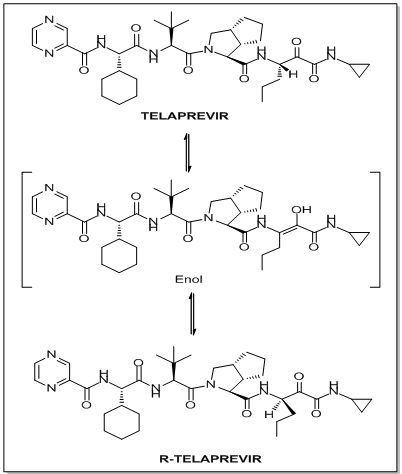Telaprevir epimerises at position 21 via keto-enol tautomerism in vitro and in vivo to form its R-Telaprevir. R-Telaprevir was 30 fold less active than Telaprevir. The sponsor has also proposed specification limits for R-Telaprevir in the API and finished product of 0.5% and 3.5%, respectively. The LLOQ for telaprevir and R-Telaprevir in human plasma and urine was set at 2.00 ng/ml. (Lower limit of quantitation [LLOQ]) [15].