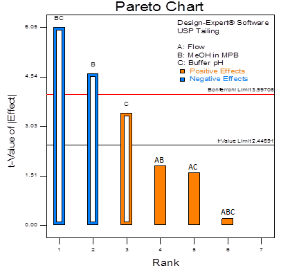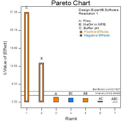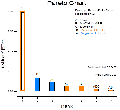 The effect of the Critical Method Parameters (independent variables) on the three Critical Quality Attributes (3 dependent variables) was explained by using Pareto charts (fig. 4, 5 and 6). The resolution 1 was majorly affected by C (buffer pH) and B (methanol content in mobile phase-B).