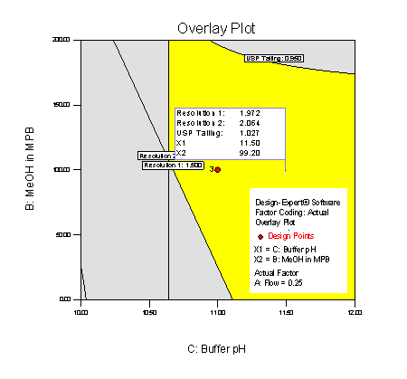 Based on method development results, flow rate, methanol content in mobile phase-B and buffer pH was selected as Critical Method Parameters (CMPs). The Design–of-Experiment for the scouting and the optimization runs was set up in Design-Expert 9.0.1 software by using two-level full factorial design options. The use of this statistical experimental design ensures that all important study factor effects will be expressed in the experimental data and taken together can comprehensively explore a multifactorial design space.