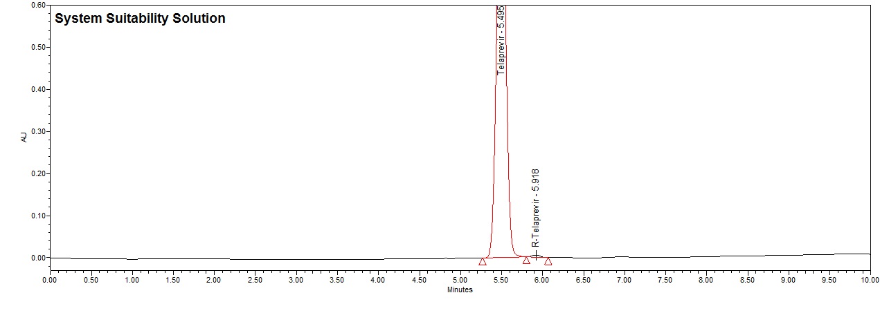 The system suitability test (SST) results were as follows: the USP resolution between the Telaprevir and the R-Telaprevir peak was 2.1 and the tailing of the Telaprevir peak was 1.1.
