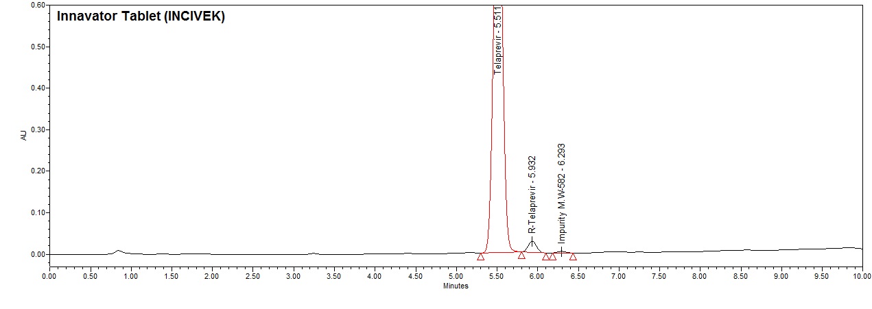 Chromatograms for Blank, System suitability solution, Innovator Tablet (INCIVEK) and Test solution (drug substance) in final Chromatographic conditions were shown in fig. 8 and 9.
