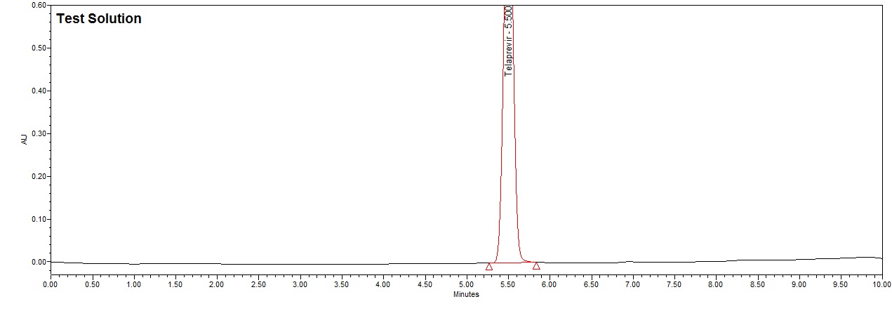 The drug was extracted from the tablet formulation of 375 mg label claim using diluent. Twenty tablets were weighed and crushed to a fine powder. Powder equivalent to 10 mg Telaprevir was accurately weighed into to a 10 ml volumetric flask and made up to volume with diluent. The contents of the flask were sonicated for 1-2 min to enable complete dissolution of Telaprevir. The solution was filtered with Randisc PVDF 0.22μm filter.