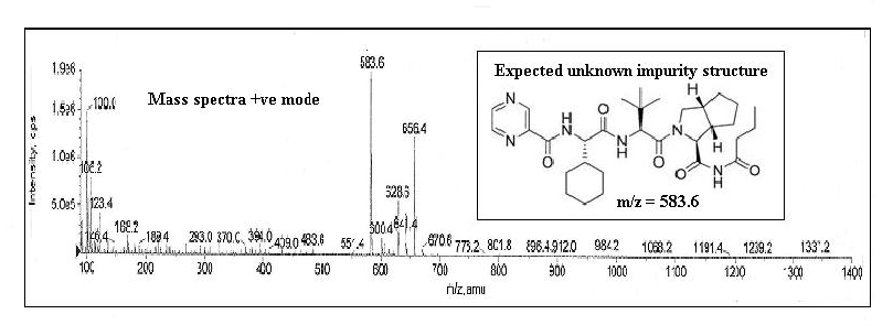 From LC-MS data the unknown impurity which was observed in Water degradation sample shows protonated molecular ion at m/z = 583.6. The possible expected structure of the unknown impurity (m/z = 583.6) was shown in fig. 10. Peak purity plots along with spectrums for Telaprevir, R-Telaprevir and unknown impurity (m/z = 583.6) peaks were shown in fig. 11.
