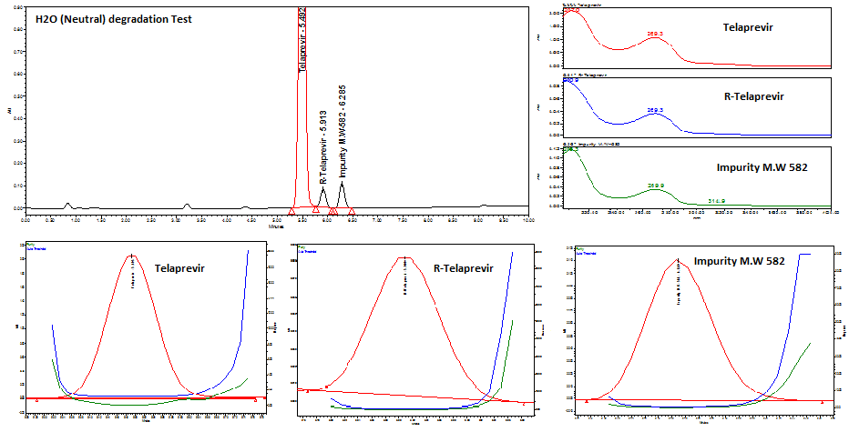 Each degraded sample was injected as such and spiked with R-Telaprevir. Peak purity for Telaprevir and the R-Telaprevir was ensured with a PDA detector. Telaprevir and the R-Telaprevir were well separated from the obtained degradation products.