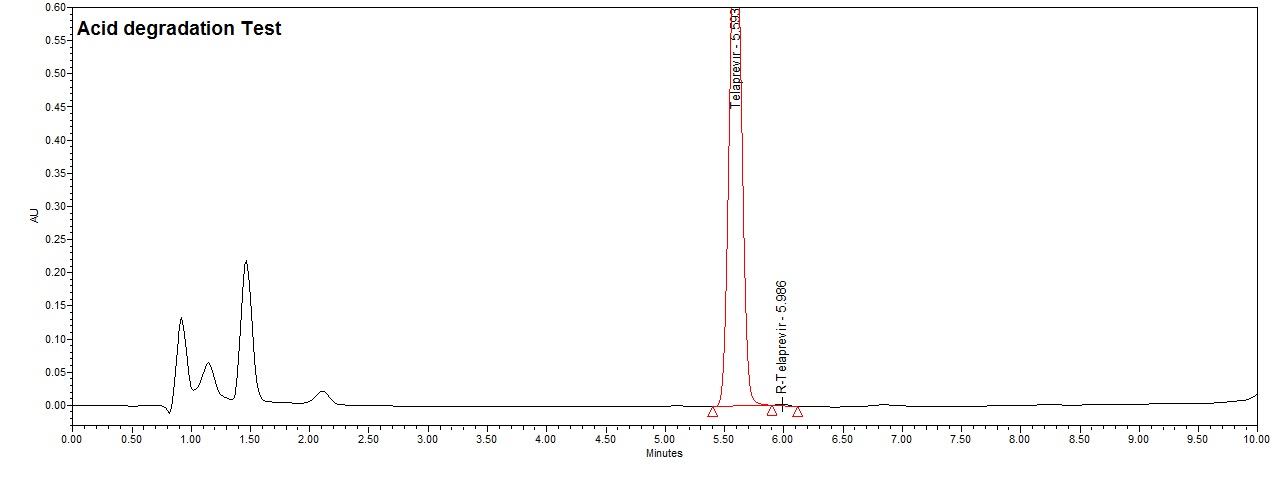 Conclusion: An accurate, precise, linear, robust and specific UPLC method was developed and validated for the quantification of R-Telaprevir in drug substance and pharmaceutical dosage form of Telaprevir as per ICH guidelines. The method is stability-indicating and can be used for routine analysis of production samples and to check the stability of samples.
