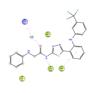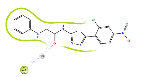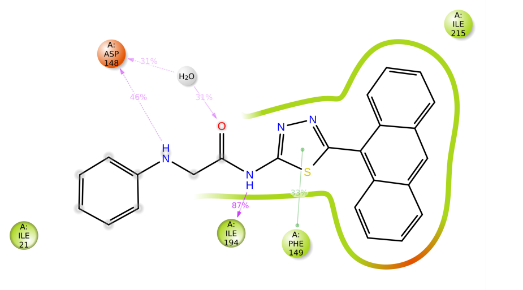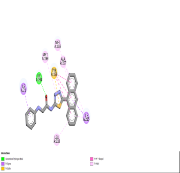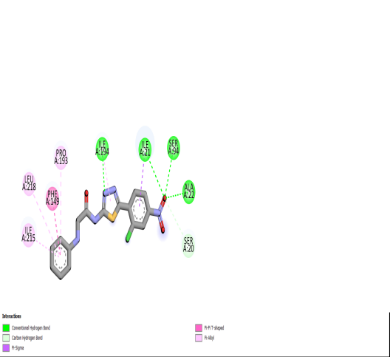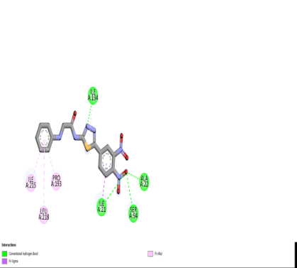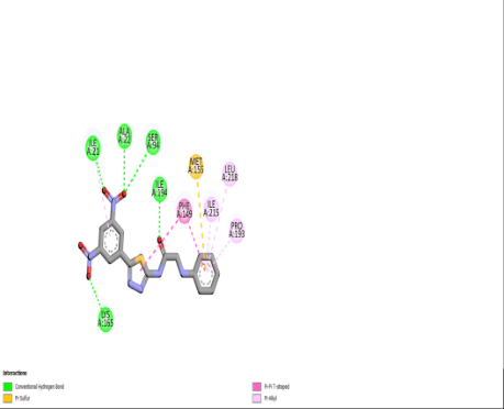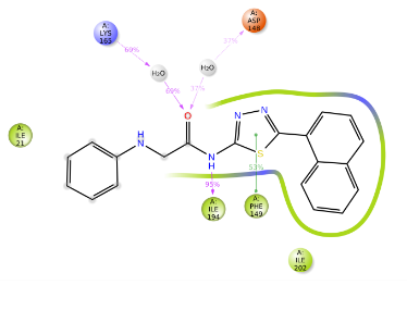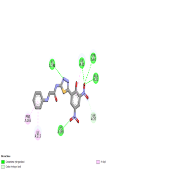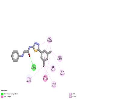 The presence of heterocyclic aromatic rings in the 1,3,4 thiadiazole were responsible for the major liphophilic interactions experienced in the molecular docking studies. Some amino acids in the ligand binding position of InhA were identified [29, 30]. Some prominentnon-covalent interactions were noticed between proposed ligands and binding sites of InhA. Several amino acids were involved in the ligand interactions with InhA which are described in table 2. So they impart inhibitory effects in the ligand binding domain of InhA.