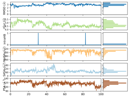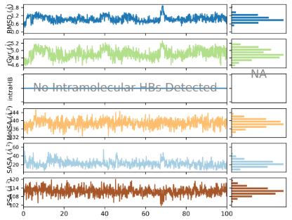 Fig. 3: (a) RMSD (b) ligand properties (c) Protein–ligand histogram (d) Time line representation of protein ligand complex (e) Fitting pose interaction in 2D view of TDZ8