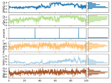 Fig. 1: (a) RMSD (b) ligand properties (c) Protein–ligand histogram (d) Time line representation of protein ligand complex (e) Fitting pose interaction in 2D view of TDZ10