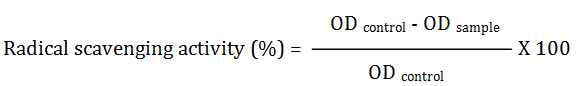 The assay was carried out in a 96 well microtitre plate. To 200 µl of DPPH solution, 10 µl of the extract or standard solution was added separately in wells of the microtitre plate. The plates were incubated at 37 oC for 30 min and the absorbance of each solution was measured at 490 nm using ELISA reader.