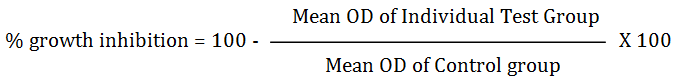 0.1 ml of the cell suspension (containing 1x105cells) and 0.1 ml of the extract (31.25-1000 µg/ml) in DMSO were added to the 96 well plates and kept in carbon dioxide incubator with 5% CO2, at 37 °C for 72 hours. Blank contains only cell suspension and control wells contain 1% DMSO and cell suspension. After 72 hours, 20 µl of MTT was added and kept in carbon dioxide incubator for 2 hours followed by 80 µl of lysis buffer (15%SLS in 1:1 DMF and water). The plate was covered with aluminum foil to protect it from light. Then the 96 well plates are kept in the rotary shaker for 8 hours. After 8 hours, the 96 well plates were processed on ELISA reader for absorption at 562 nm. The readings were averaged and viability of the test samples was compared with DMSO control. The percentage growth inhibition was calculated using the following formula