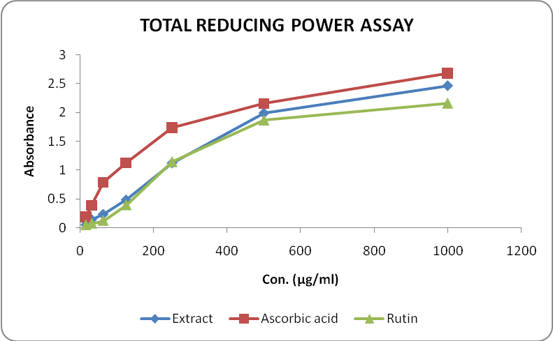 Fig. 2 shows the reducing power of hydroalcoholic extract of Salacia fruticosa Heyne ex Lawson-Root was compared with the standards ascorbic acid and rutin. Absorbance of the extracts was increased when the concentration increased. A higher absorbance indicates a higher reducing power.