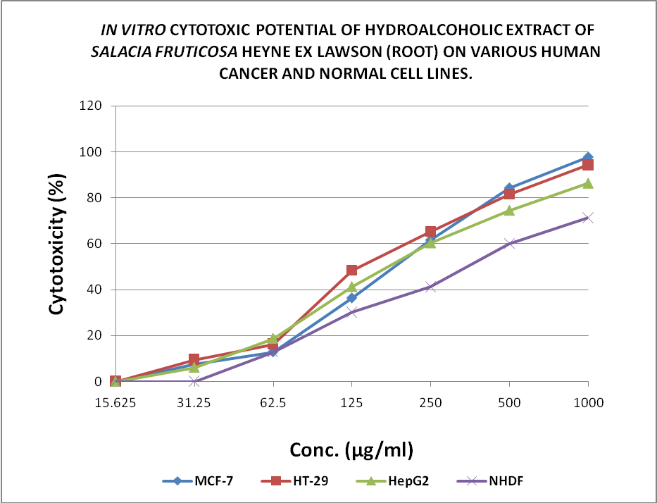 Cytotoxicity of hydroalcoholic extract of Salacia fruticosa Heyne ex Lawson-Root was evaluated using MTT assay. The IC50 values of extract on different human cancer cell lines was found to be 129.13 μl/ml, 151.33 μl/ml and 203.25 μl/ml for Human Colon Cancer Cells (HT-29), Human Liver Cancer Cells (HepG2) and Human Breast Cancer Cells (MCF-7) respectively.