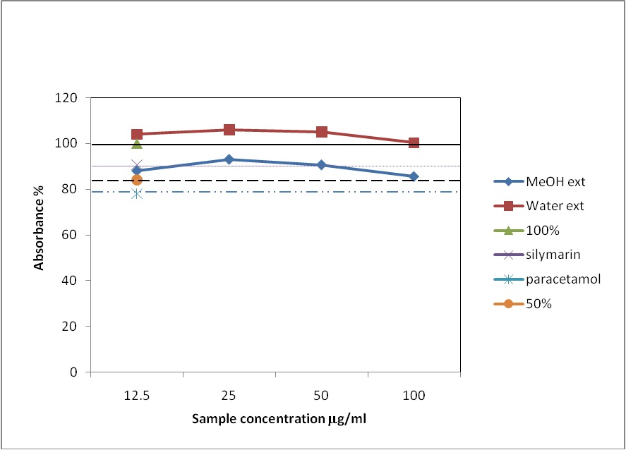 The hepatoprotective activity results of Grewia tenax Forssk. fruits extract (80% MeOH extract of defatted powder) and water extract indicate that they exhibited hepatoprotection at (25 μg/ml and 50 μg/ml) and (12.5 μg/ml to 100 μg/ml) respectively (fig. 2).