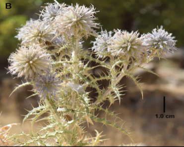 This plant species can be described as a perennial, spiny, and hairy plant that grows 60-100 cm long. The leaves are long and dissected, with spiny segments. The flower heads are spherical, spiky, 4-5 cm in diameter, and have a pale blue color. In the Arab region, particularly in Jordan, this plant is known as "chouk el Jemel" and grows wild in waste places and hills. The plant is also found growing wild in the Mediterranean region, including countries like Iraq, Lebanon, Syria, Jordan, Palestine, Saudi Arabia, and along the North African Mediterranean coast.