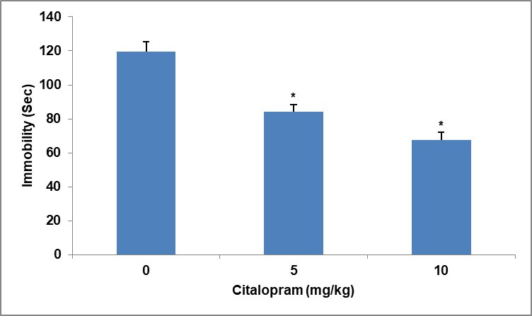 Fig. 1: Dose response of the SSRI positive control, citalopram, in the FST. DMSO (10%) served as the vehicle control (0 mg/kg). Vehicle control or citalopram (n=6 per group) was injected 30 min before the test. Data were evaluated using analysis of variance, followed by LSD post-hoc tests, where *p<0.001 was considered significantly different from the vehicle control. The data are expressed as mean±SEM