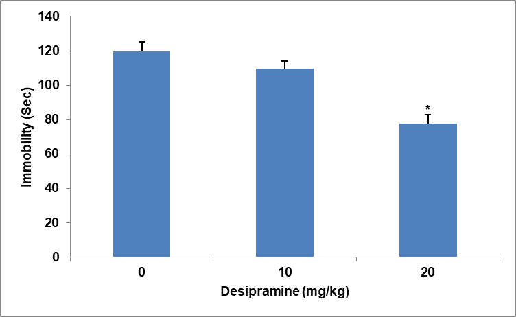 Fig. 2: Dose response of the TCA positive control, desipramine, in the FST. DMSO (10%) served as the vehicle control (0 mg/kg). Vehicle control or desipramine (n=6 per group) was injected 30 min before the test. Data were evaluated using analysis of variance, followed by LSD post-hoc tests, where *p<0.001 was considered significantly different from the vehicle control. The data are expressed as mean±SEM