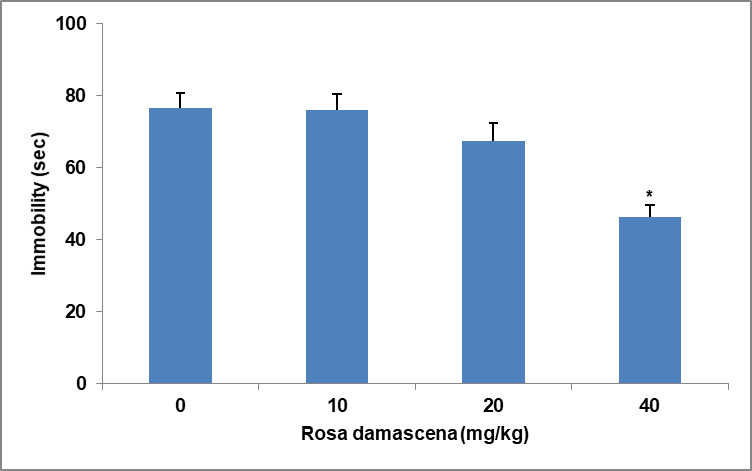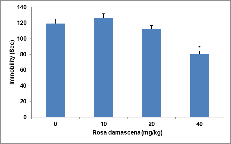 Methods: Maceration was used to create an aqueous extract of Rosa damascena. The Tail Suspension Test (TST) on BALB/c mice and the Forced-Swimming test (FST) on C57BL/6 mice were used to quantify the antidepressant activity. Mice were divided into three groups: control (saline), standard (citalopram and desipramine), and Rosa damascena aqueous extract (n = 6 per group). Intraperitoneally (1 ml/100 g) injections of drugs were administered. Analysis of variance was used to examine the data, and then LSD post-hoc tests were performed. The data are expressed as mean±SEM.
