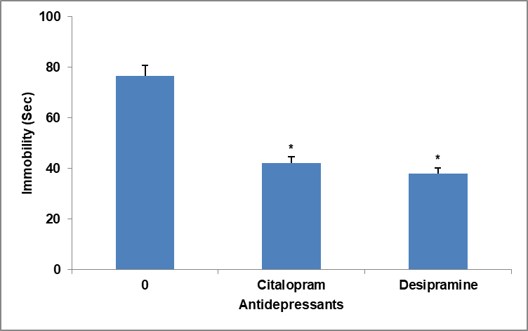 Fig. 4: Effects of citalopram (10 mg/kg) and desipramine (20 mg/kg) in the TST. DMSO (10%) served as the vehicle control (0 mg/kg). Vehicle control, citalopram, or desipramine (n=6 per group) was injected 30 min before the test. Data were evaluated using analysis of variance, followed by LSD post-hoc tests, where *p<0.001 was considered significantly different from the vehicle control. The data are expressed as mean±SEM