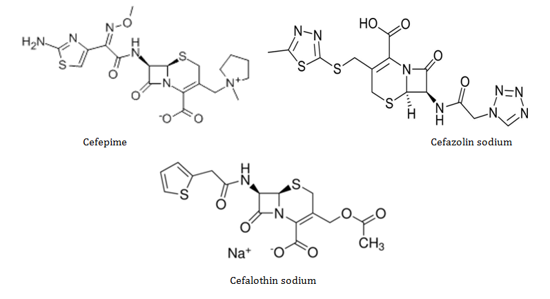 Cefepime (CEPM), cefazolin sodium (CFZS), cefalothin sodium (CFLS).