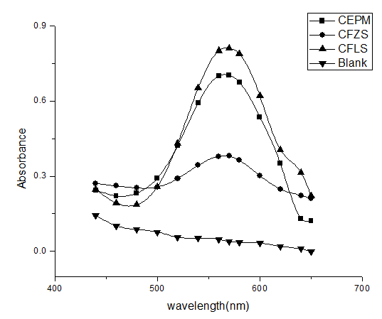 The absorption spectra of CEPM, CFZS, CFLS and blank is as shown in (fig. 1) The corresponding reagent blanks have practically negligible absorbance at these wavelengths. The unknown concentration of the drug can be calculated by knowing the absorbance at the 𝛌max using the regression equation.
