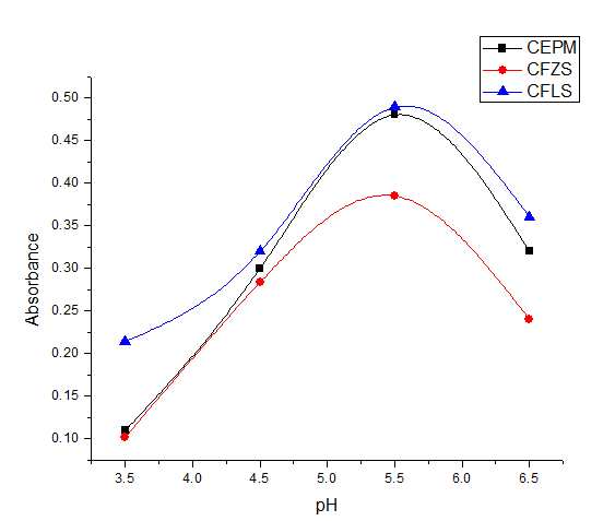 The maximum color intensity was observed at pH 5.5 in citrate buffer for all the drugs. The effect of different pH for CEPM, CFZS and CFLS is as shown in (fig. 2).