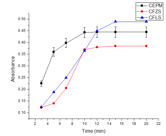 Fig. 3: Time course of color development of CEPM at (5 µg/ml), CFZS at (10 µg/ml) CFLS at (20 µg/ml)