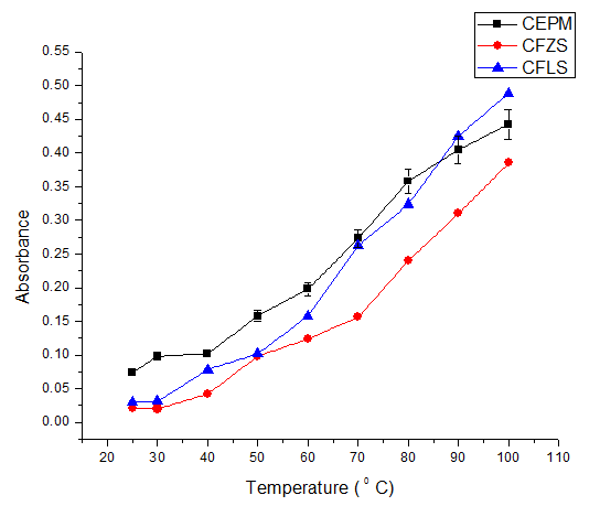 Fig. 4: Effect of temperature of CEPM at (5 µg/ml), CFZS (10 µg/ml), CFLS (20 µg/ml)