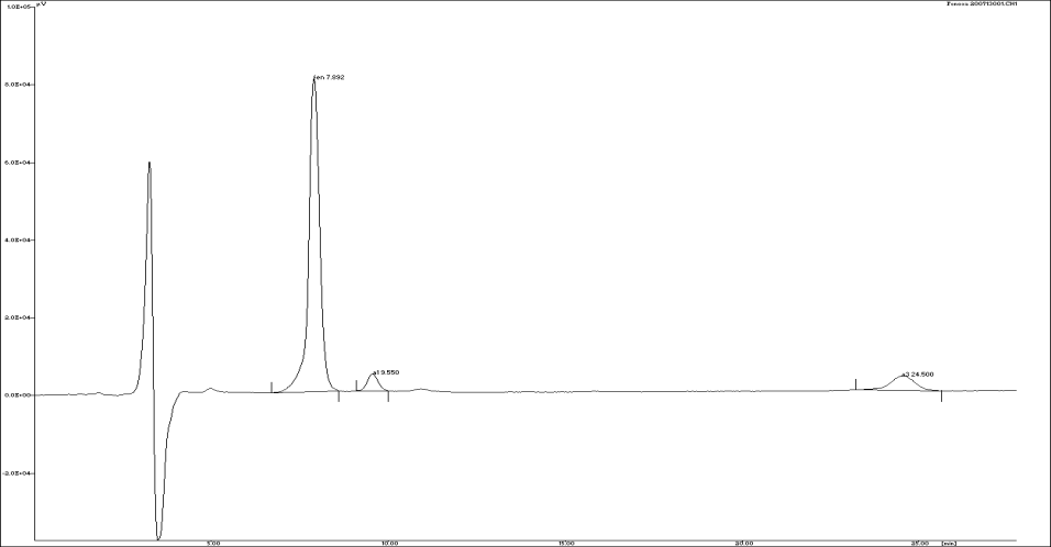 No thin layer chromatographic method for FEN and its degradation products has been reported. There are reports on thin layer chromatographic analysis of antazoline, an analogue of fenoxazoline for separation of the drug from its degradation products [18]. Different mobile phase compositions were tried to achieve a good separation of the drug from its degradation products. The mobile phase Ethyl acetate: Methanol: Diethylamine (7.5:2:0.5) was found to give a good resolution between the drug and its degradation products (fig. 3). However, the yield obtained after isolation was very low. A newer hyphenated technique, TLC-MS was explored in this study for identification of the degradation products.