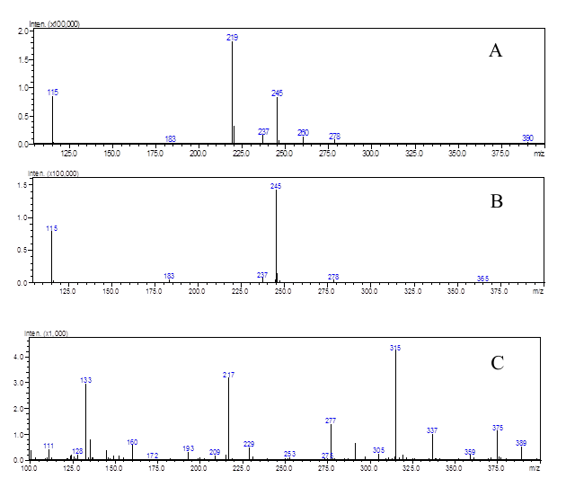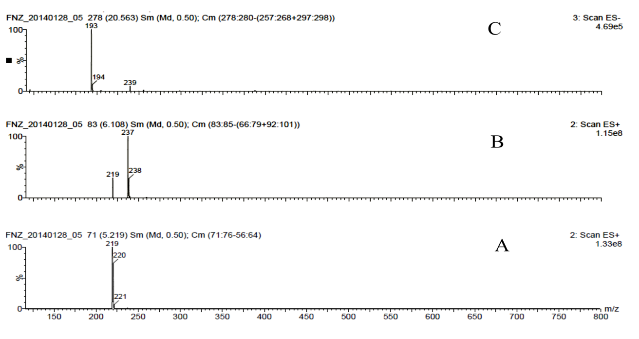 Fig. 4: TLC-MS spectrum of (A) Fenoxazoline (B) DP1 (C) DP2