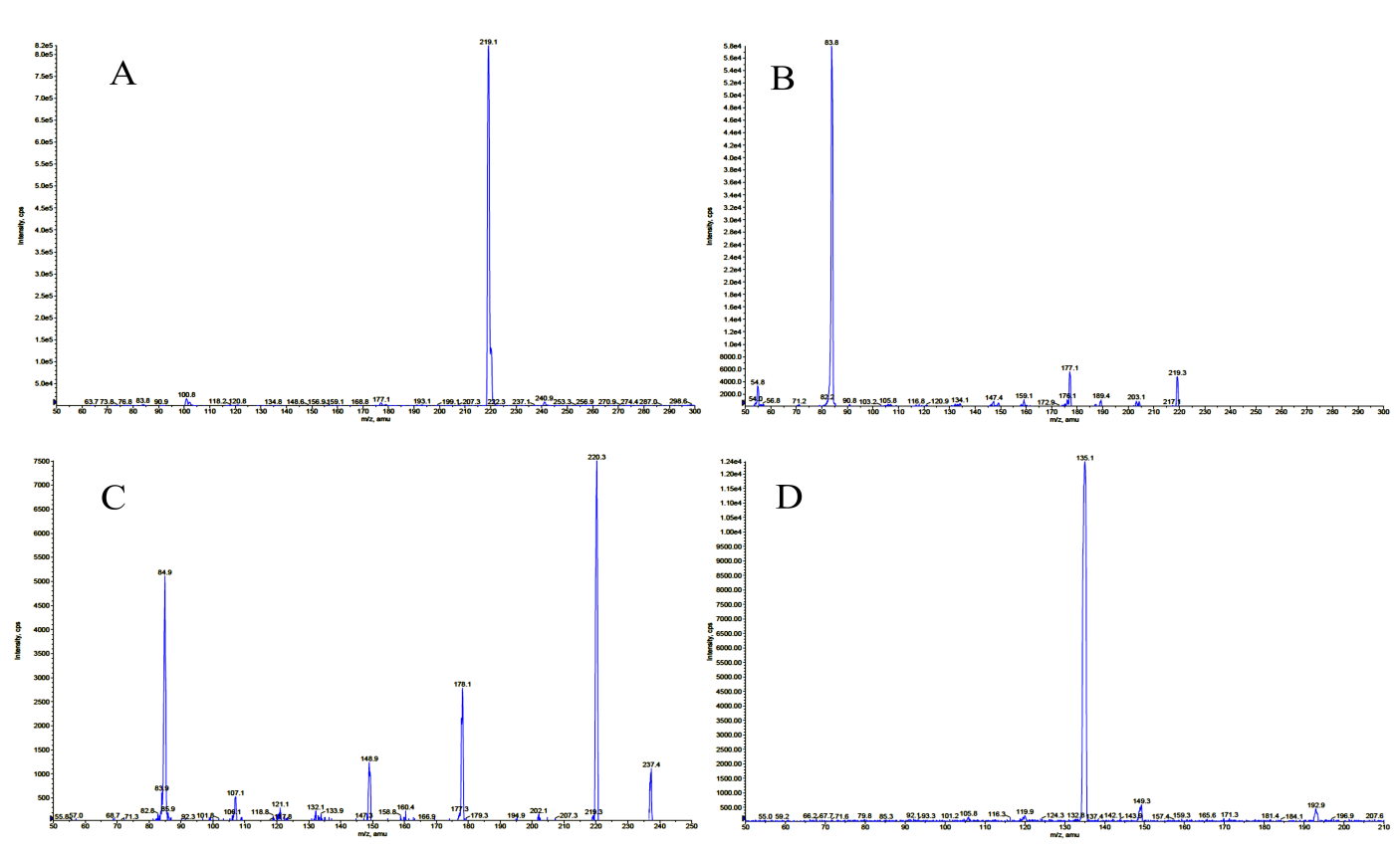 Fig. 8: (A) Mass spectrum of the fenoxazoline (B) MS/MS spectrum of fenoxazoline(C) MS/MS Spectrum of DP1 (D) MS/MS spectrum of DP2