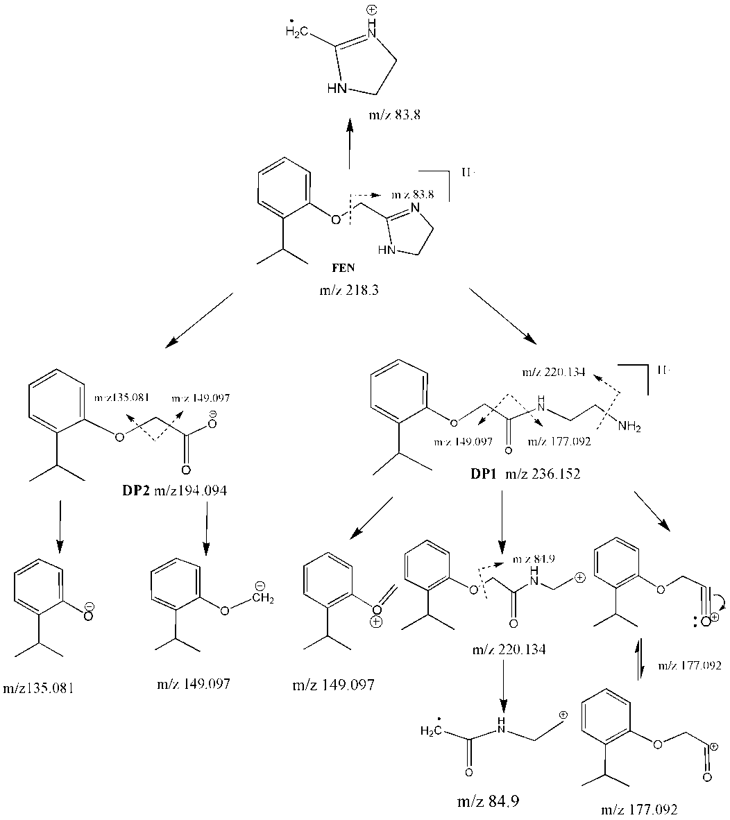 Fig. 9: Mass fragmentation pathways for fenoxazoline, DP1 and DP2